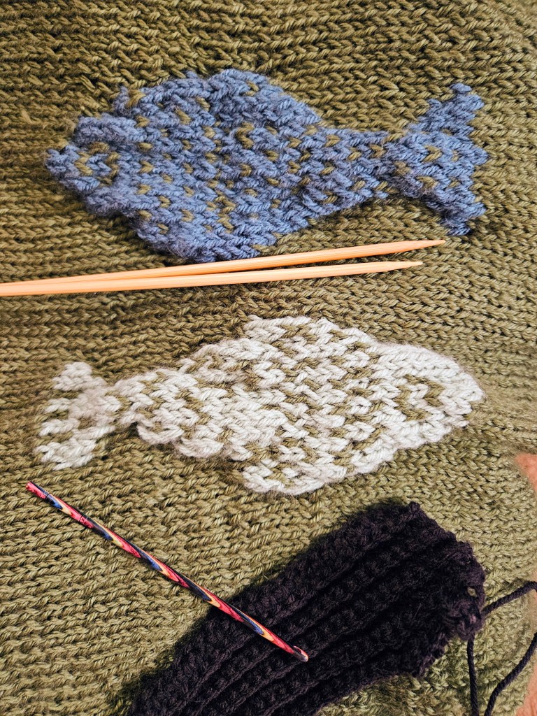 In 2025, sardines and other tinned fish became more than just food; they appeared on beaded bags, shirts, and prints. They also made their way to the fiber arts community, which inspired me to make a fish print sweater for Kyle, who enjoys fishing IRL and in video games. I just like the video game version.