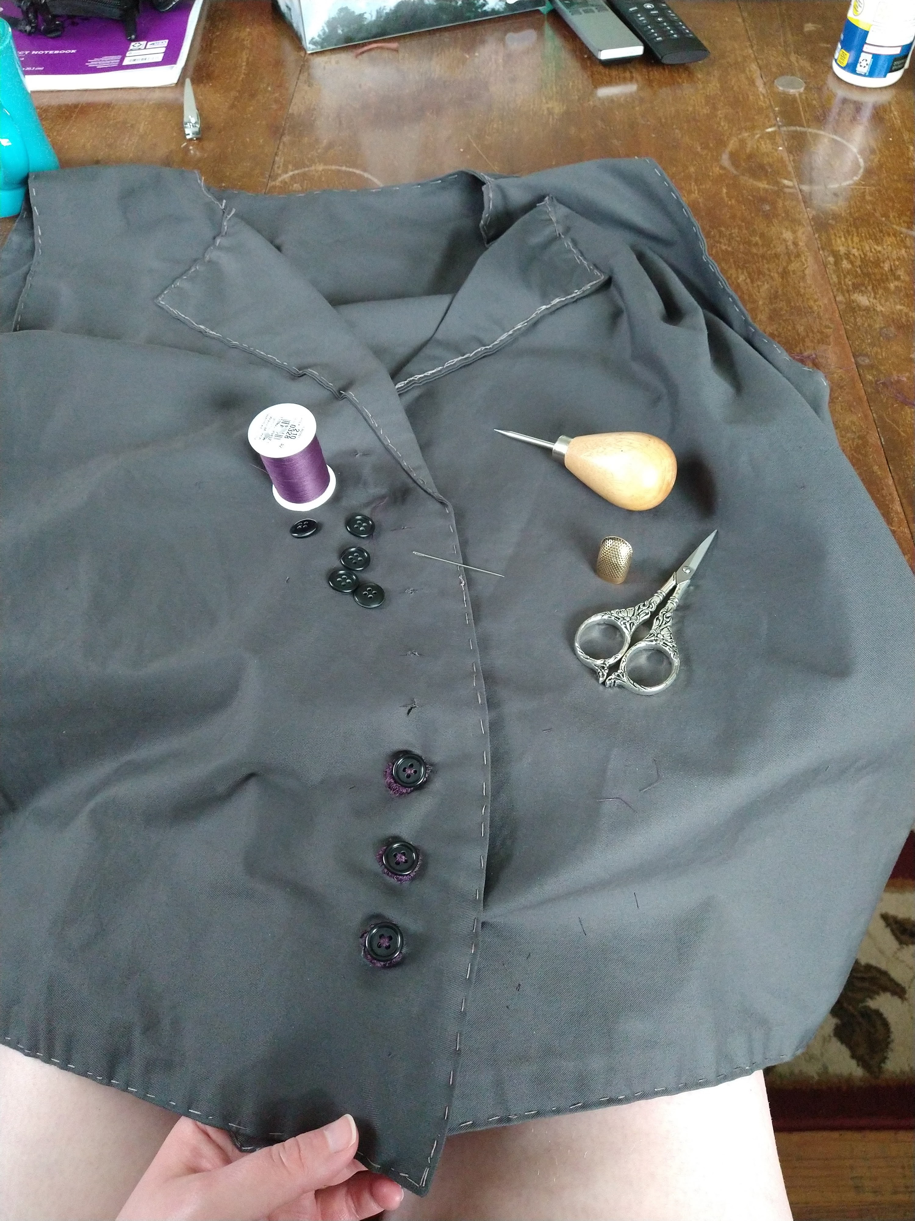 As I mentioned before in #21 – Sewing When I Lost the Love For It I have developed tendinitis in the knuckle of my middle finger of my sewing hand. This is what drove me to stop hand sewing in general and get used to using my Heavy Duty Singer machine. But alas, there are still times when you need to sew by hand like when inserting a zipper, mending rips and holes in fabric, and button and buttonhole insertion. I ran into this problem whilst completing this vest for my father-in-law. Just a few hours of hand sewing these buttons and button holes, awaken my injury and my knuckle was not happy. It’s made hand sewing a bit tense for me because what if it keeps getting worse? I love doing this, I don’t want to stop making things or knitting.