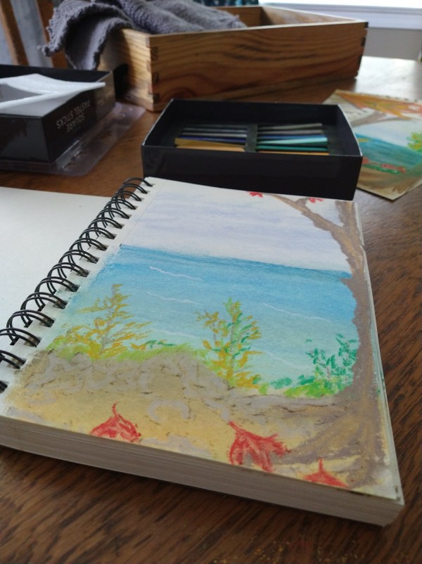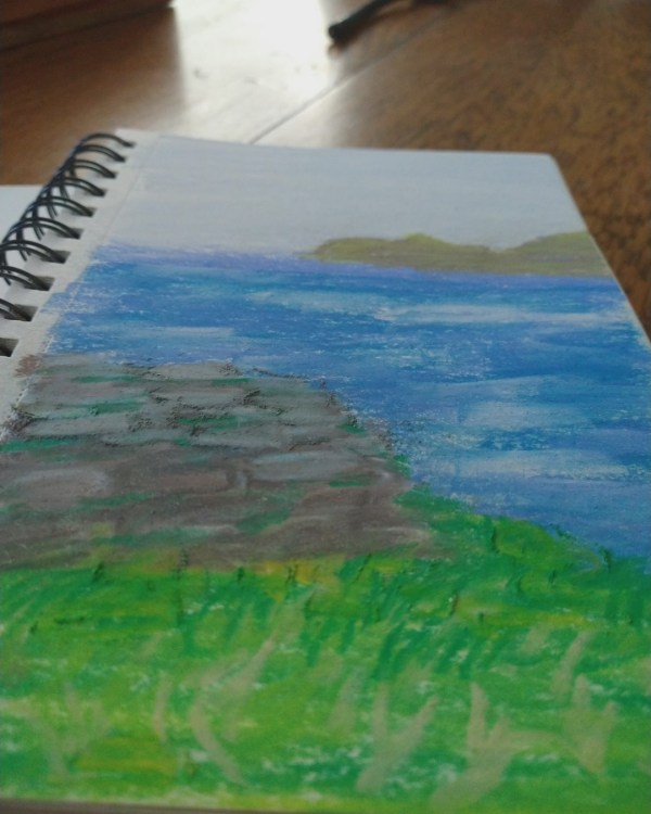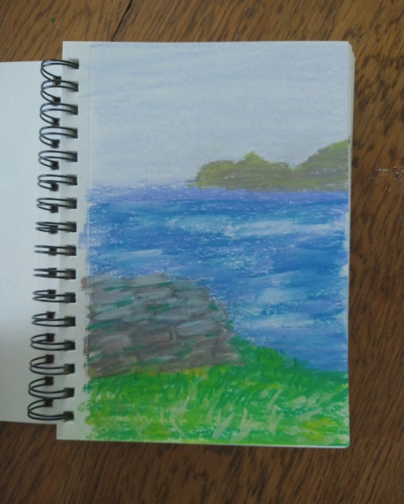 A memory from 2001, the drive around the ring of Kerry. This is a view, near Slea Head looking towards the An Fear Marbh (The Sleeping Giant/Dead Man) Island. A quick sketch made with chalk pastels. At the time, I didn’t understand the grandeur of what I was staring at when I was eight, but now the beauty of Ireland’s scenery lives rent-free in my mind.