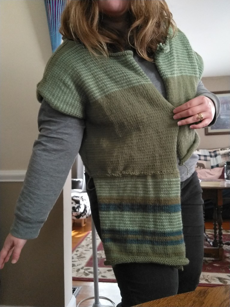 I am not using a pattern for this project but I am making it up as I go along. I’m taking notes as I go to draft a pattern by process and for easier replication of the shoulder pieces. The shoulders are fitting fantastically! This current project is far more comfortable than my 2021 attempt. This new project is a blend of four colors of yarn. The stripes of the bottom section will be carried on in the sleeves. My plan is to make striped, colorful sleeves and a hood or dramatic collar. There will be a ribbed bottom edge added at the end to mitigate the rolling of the hem. I debated on making this a sweater dress after learning those are apparently trending for Fall 2023 but chose to continue with the cardigan plan as I think I will get more wear out of this.