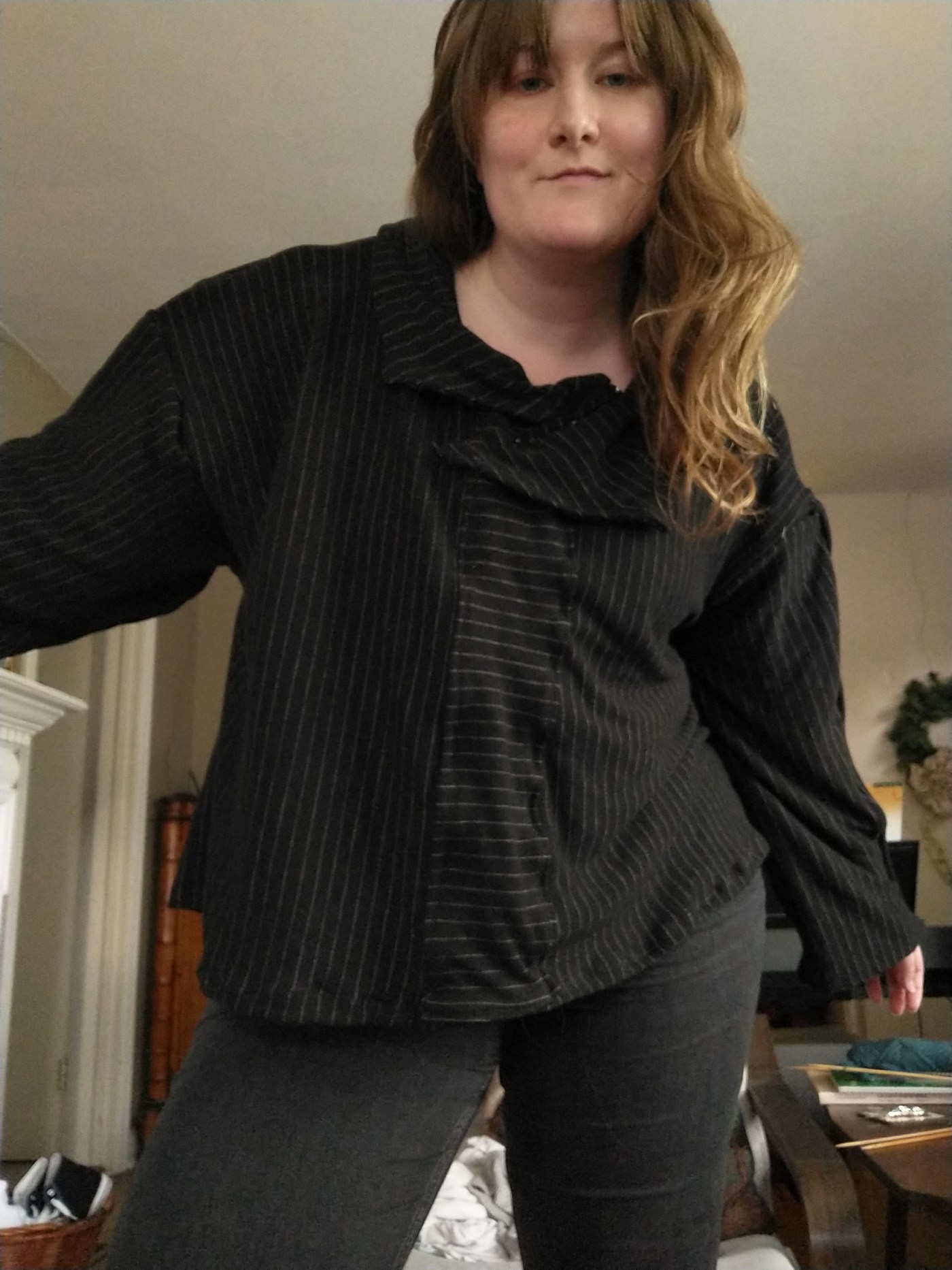 Today I decided to trim the bottom off, and then I trimmed a bit more because I cut it wrong. With the lapel collar pinned and one sleeve sewn in, I tried it on and reflected on the length. The long cardigan shape now a cropped hip-skimming garment, stopped and pondered. It needed something.