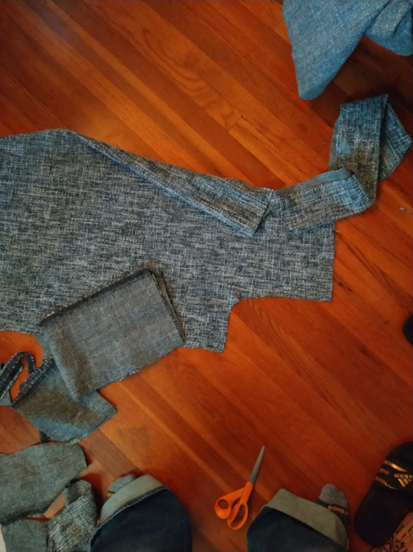 For moral support, I played a fellow chaos sewist in the background, Stephanie Canada, and laid my fabric on the floor. I determined my cut lines and set them to work, as Stephanie set to work on her #grimgrinninggarb I set my scissors to work carving out the back coat panel.
