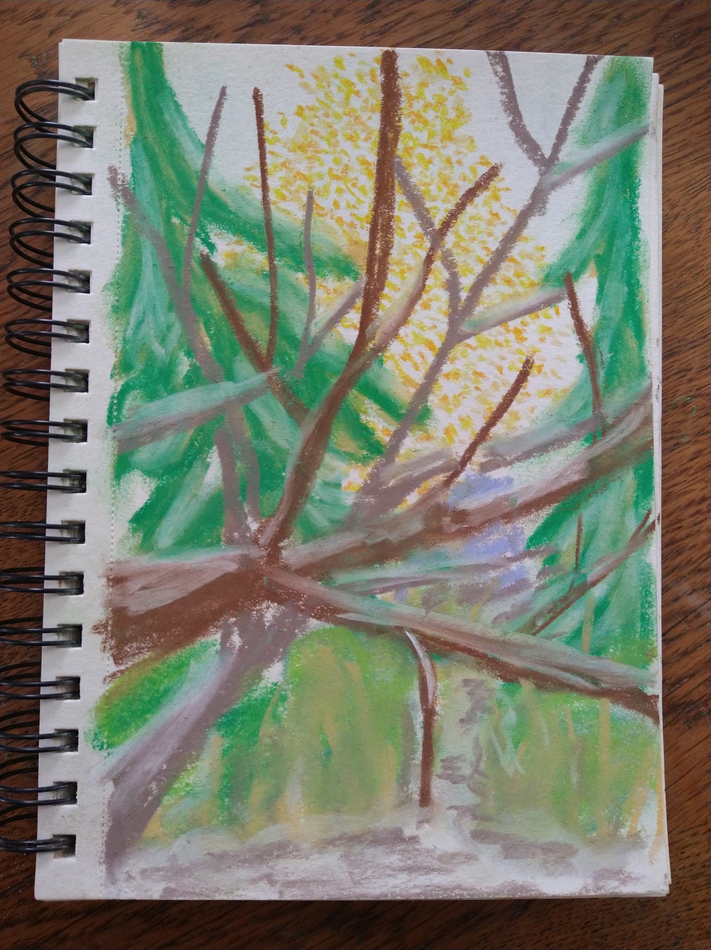 From the gloomy shades of autumn and their spooky splendor to the bright, starkness of winter in one night. A remnant of autumn hangings on in the trees beyond my street. The lovely yellow leaves I saw through my window. A bright, hopeful contrast from the pine, the branch, and the white. This was my inspiration.