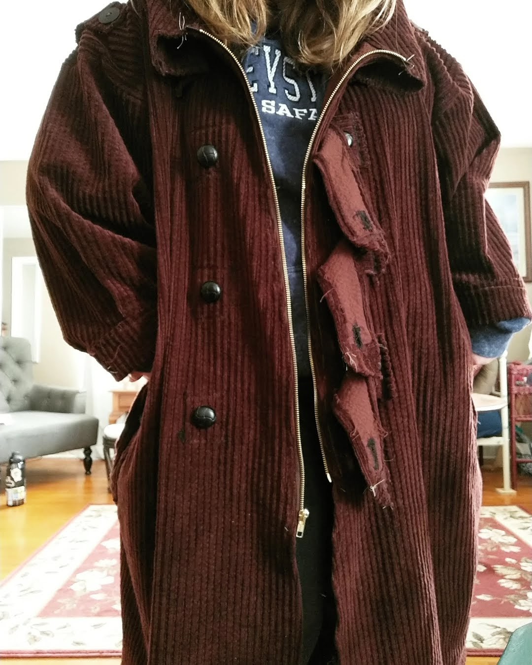 After a wear test this past weekend I realized my Jack Sparrow-inspired coat needed a few more touches to truly pop. Including accessories which will be coming soon. As for the coat, it was missing that polish, you know? So I took the belt and chopped it into five rectangles to make the button tabs and the pocket flaps. I also added more buttons! Two more styles, actually. I added leather-inspired buttons for the chest tabs and a tortoiseshell set to the lapels and the pockets. The pockets have closing buttons for security which was desperately needed because I was close to losing my phone on Saturday due to those gaping pockets. For only having the yardage from the belt to work with this turned out well. Is it a complete project? Time will tell. 🙂
