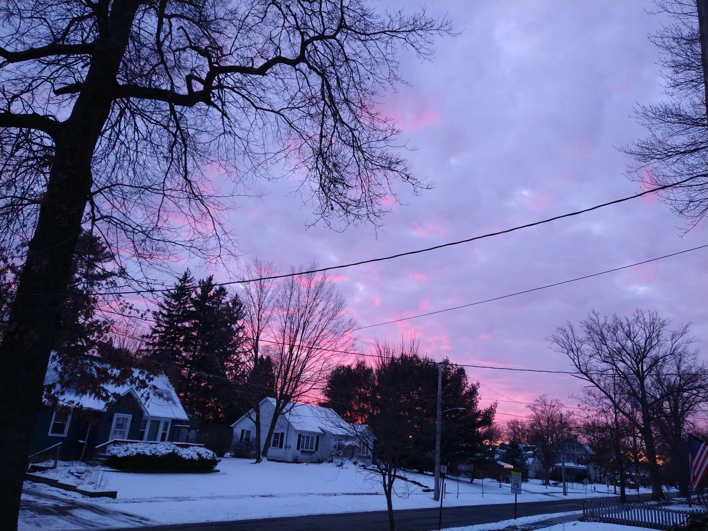Yesterday, as I video chatted with my mom a beautiful sunset washed across the sky above my house. The clouds glowed a cool icy lavender and the sun began trekking westward on a pink and orange fire. It was stunning, a showstopper. A sight I look forward to each year because sunsets, in my opinion, look more beautiful against the canvas of snow and leafless trees. There is a stark contrast that doesn’t appear real and yet it is.
