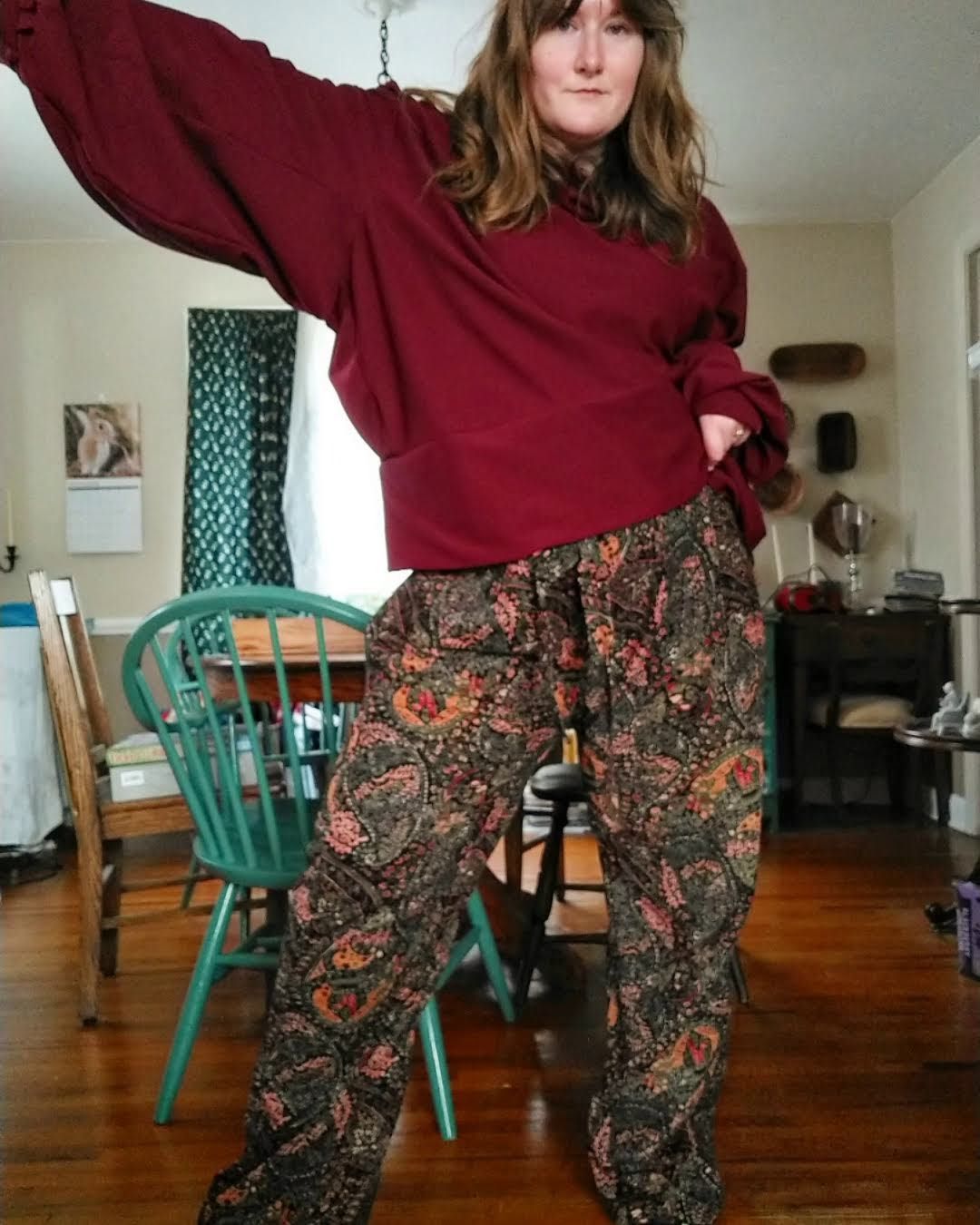 Enter this cranberry stretch fabric that was warm but with a texture that looked like a sweatshirt. I went into the unknown and decided to make a cowl neck for the first time and I’d say it turned out just as I wished. I don’t like wearing things off the shoulder anymore therefore I made the cowl neck opening smaller than the inspiration piece. I added cuffs as a cuffed bottom to encourage the garment to hang in a boxy fit but not ride up as I move through out my day. It does as it is asked. I’ve worn this piece with jeans, leggings, and these corduroy pants and I have to say it’s pretty dang versatile.