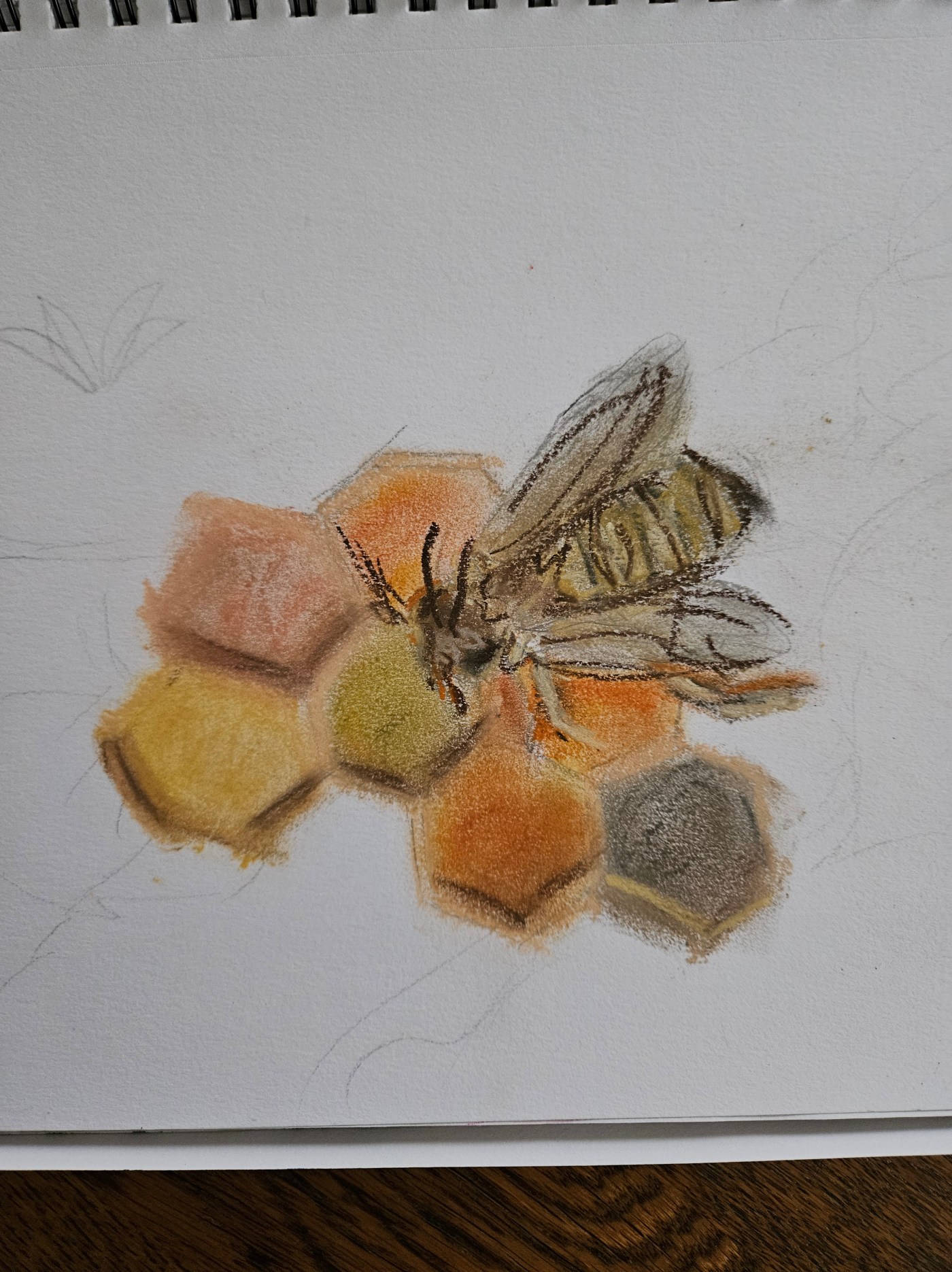 A study of a honey bee, building honey comb and filling the cells with golden stores.