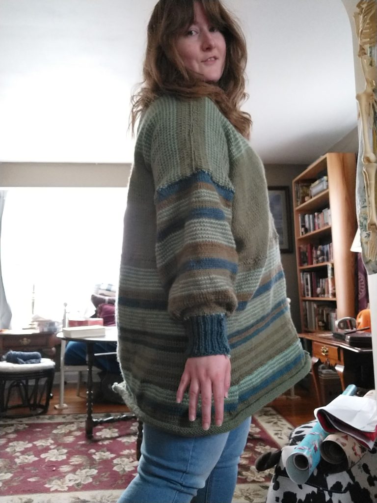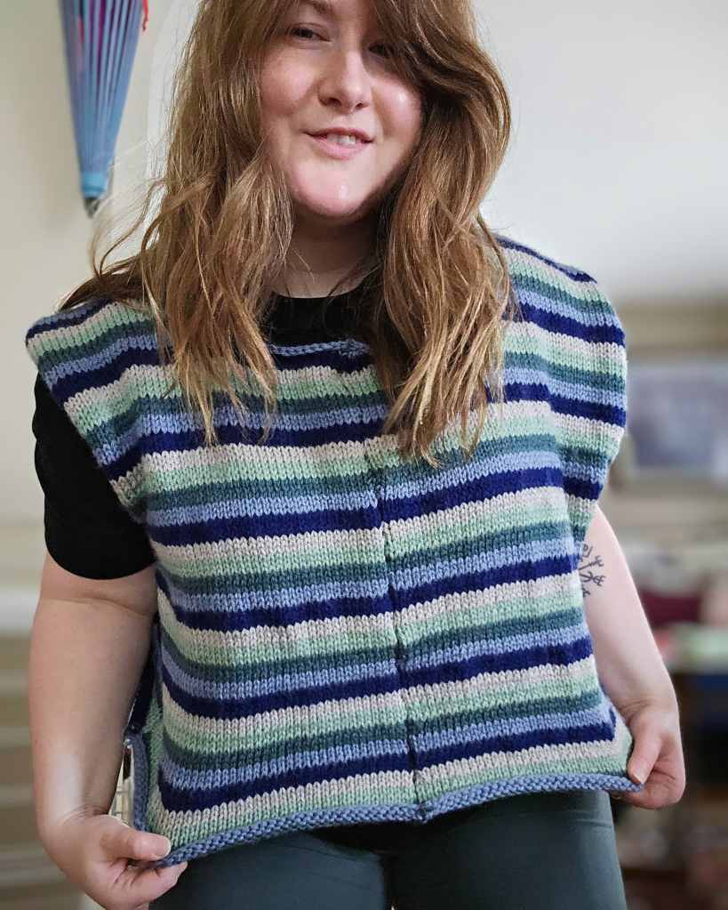 It took being willing to approach knitting the way I feel comfortable instead of the way others feel comfortable, like knitting on straight needles, and taking the scenic route in my knitting technique to learn and improve. I had to accept that my pieces were going to look different because my approach was different than how I was being taught. Because of my background in art and sewing, I think about garment creation as I would in sewing. Knitting is the opposite, instead of cutting shapes out of a whole, you are making the whole shape out of nothing, it’s a brain teaser. It was at least until I took time to think about it.