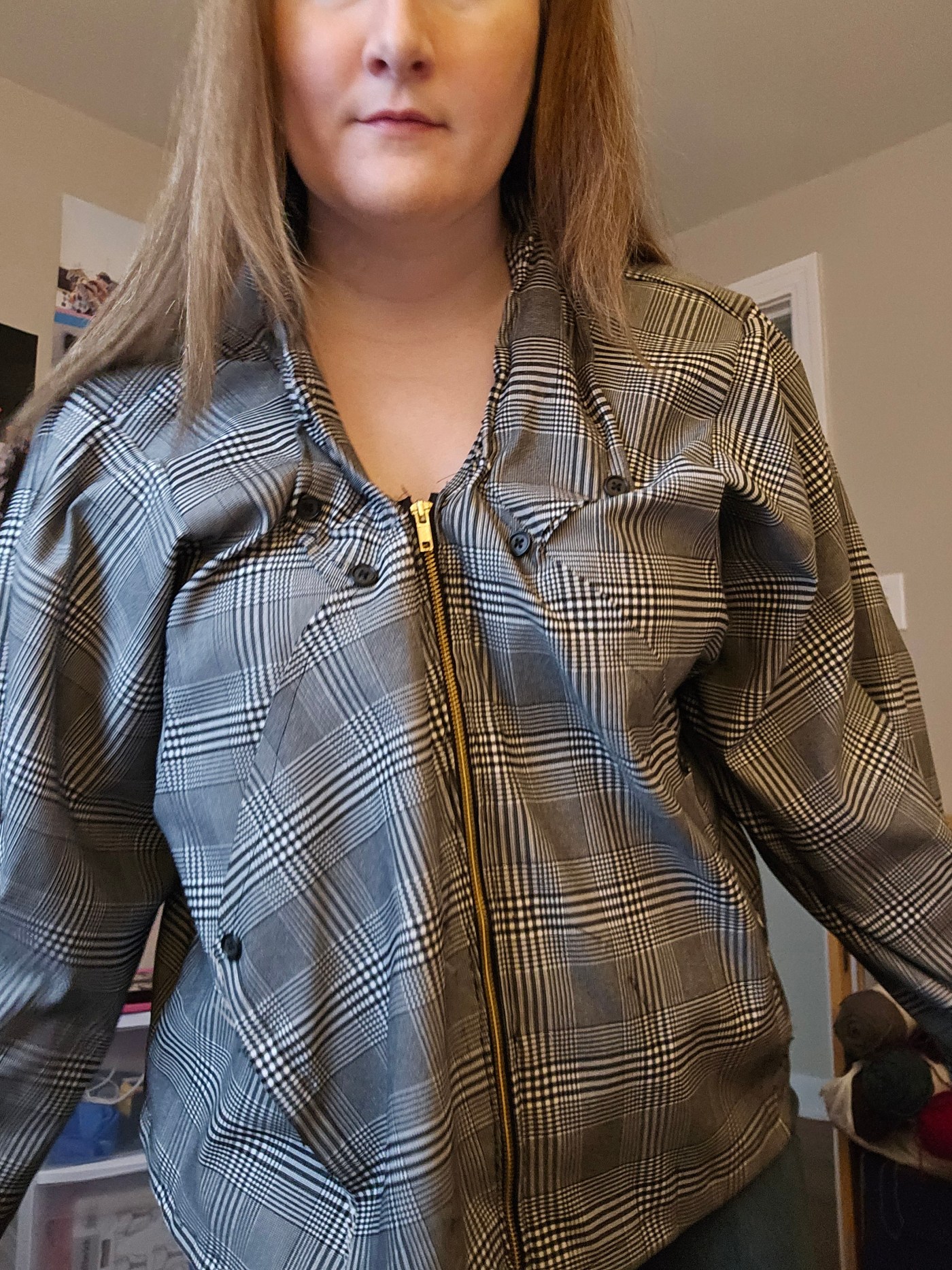 With the wide lapels, I pinned them back against the jacket to create these triangle shapes on the body of the jacket top. I decided to lean into the attitude of the silhouette to add an exposed zipper and black buttons for a bit of a British punk little spice. I anchored the collar down in the front, balancing the chaos and structure into a garment that walks the line between blouse and blazer. It’s comfy, it’s fun, it’s versatile. I’ve styled it with flare, baggy jeans as pictured. I’ve styled it as a blazer over a cocktail-style dress. I know it will be fun to try it out over cargo pants, skirts, shorts, etc. I look forward to it! I also look forward to wear my designs evolve from here as moving forward I plan to become more cohesive in my aesthetics and collections.