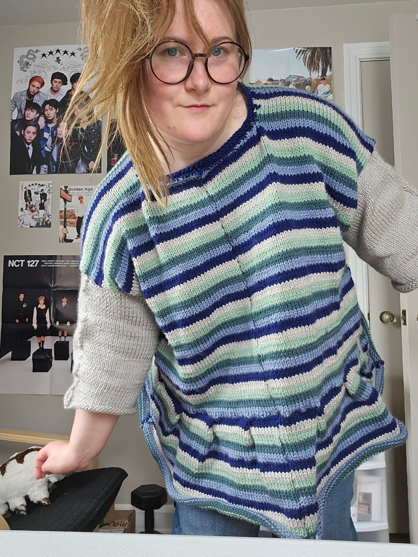 A new technique I used for this sweater was to knit one side at a time. I knit I believe 60 stitches across and began my striping pattern, switching colors after three rows. Next, I bound off stitches at my desired armhole position and carried on to the neckline where I again bound off stitches which made the shoulder more narrow than the rest of the garment. I then continued to knit down the back of the piece, mirroring the neckline by casting on a new row. I continued on to the armhole where I again, cast on more stitches and then followed the piece down to match the length of the front.