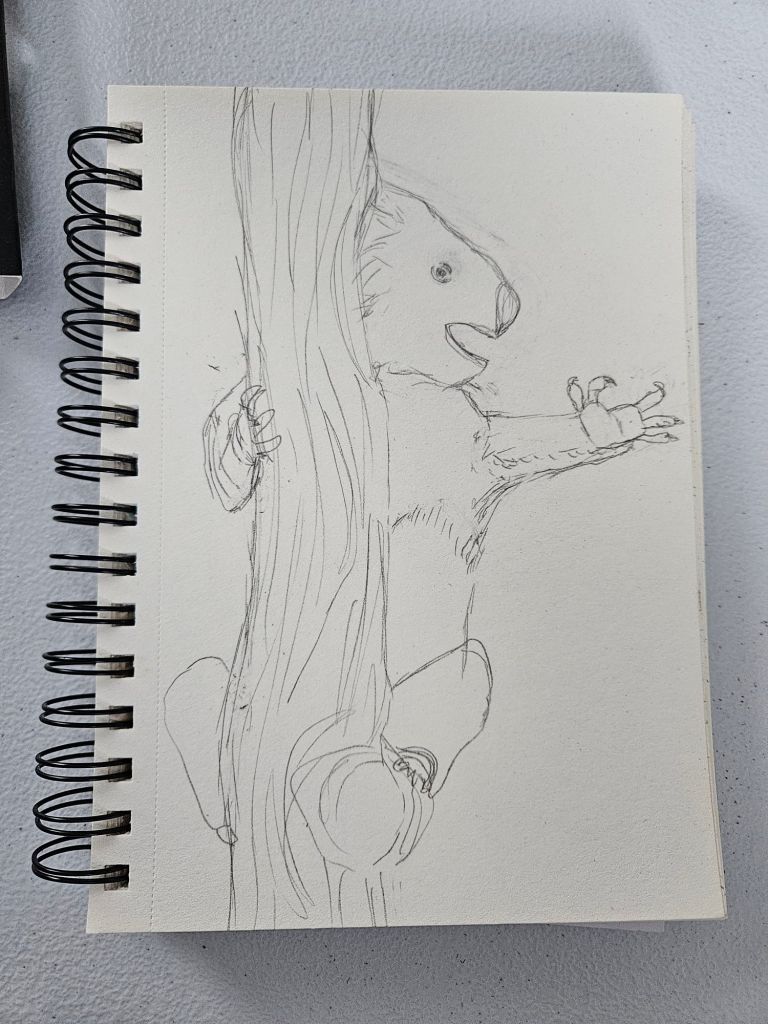 The photograph I used was zoomed in and focused on the koala and its expression. I could let the background fade out of focus and let the koala’s emotions and communication be the star. But the koala crawling across the limb, framed with smaller branches, added clutter to the image. As a photograph, it works because the composition is made for it. As a sketch it was fine, but as a piece of art with color and texture it falls flat. I’m not satisfied with it.
