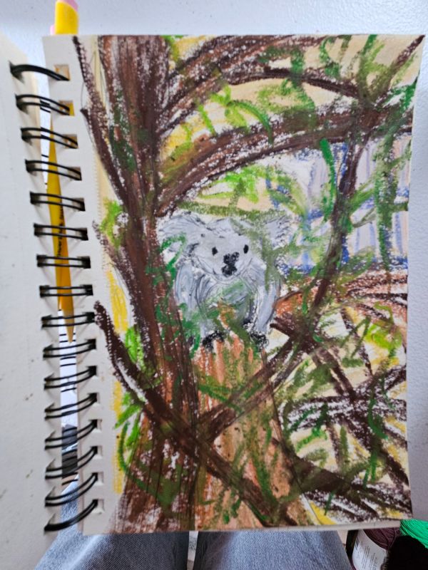 I hoped that my second koala drawing would produce the same result but this is not what happened, and it took me a while to figure out why. The original sketch had positive and negative space, and form, and had a focal point – the koala crawling across the main limb of the tree. But, once I added color through my oil pastels, the focal point became murky.
