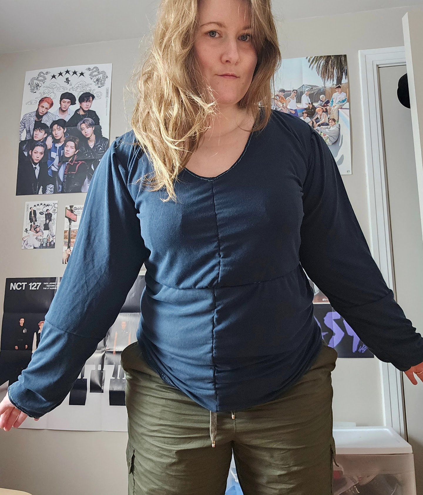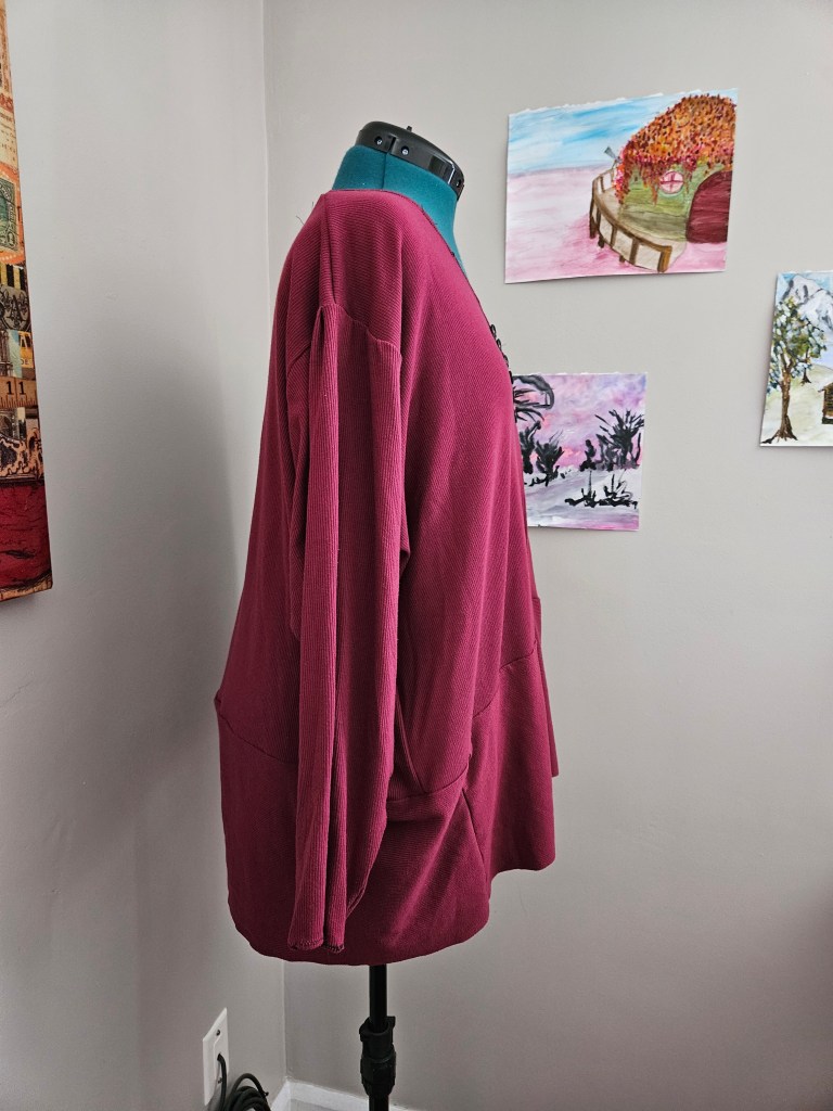 Materials: 2 yards of stretch knit jersey and 6 buttons. It is a heavier weight jersey and feels like a light sweater. This was a remnant cut. I developed my first official bodice pattern from this process.