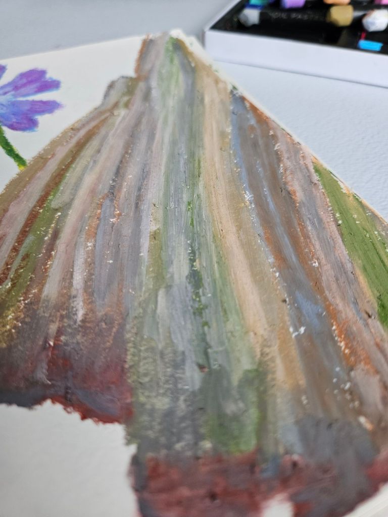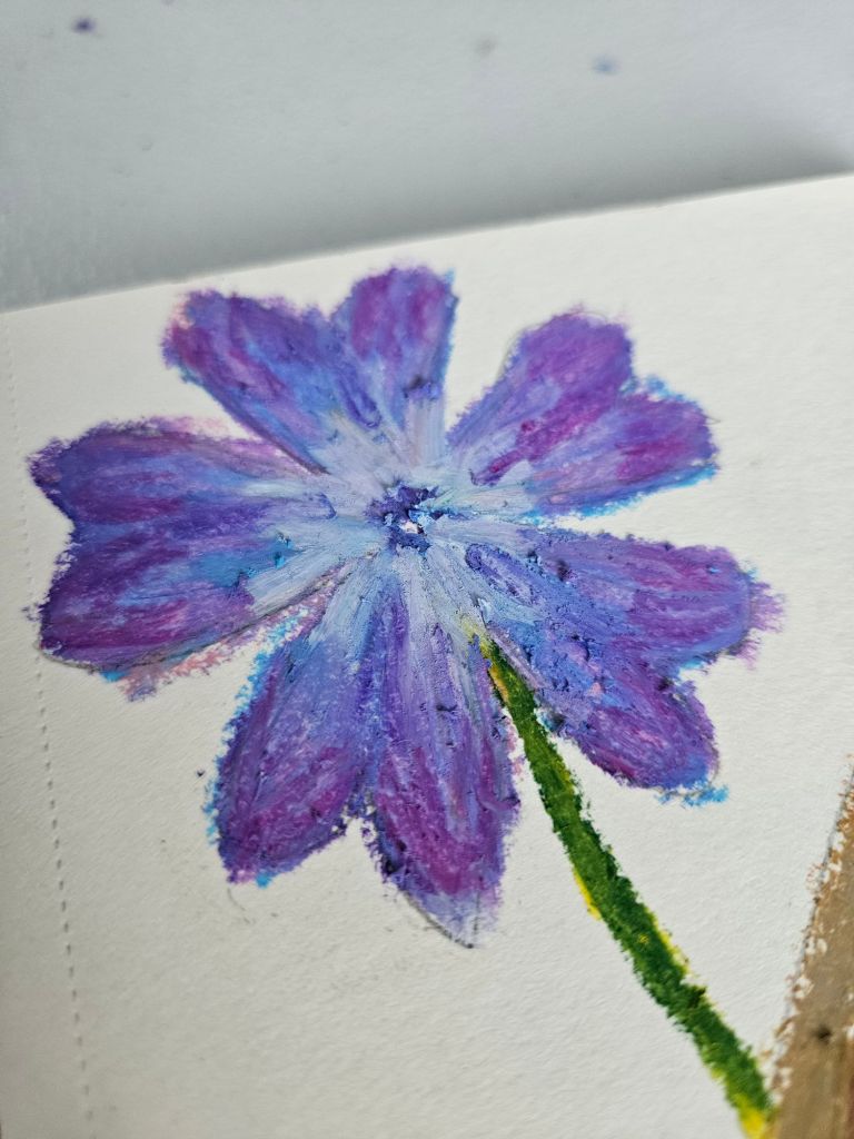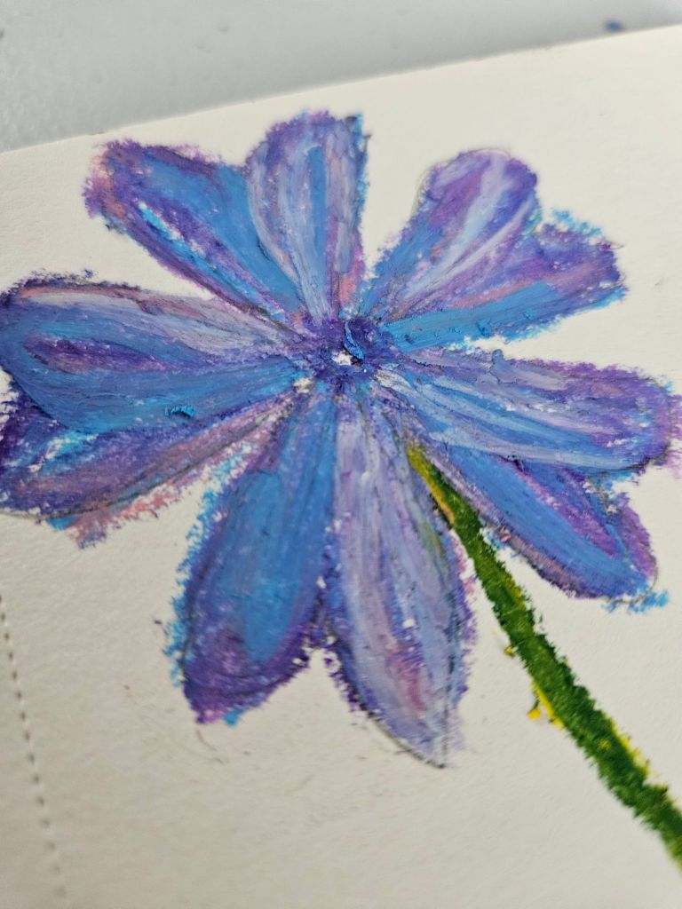 Oil Pastel on paper. Sketched in pencil. Wildflower, rock, and weeds as I remember them on a late April day or early May day. To be honest, this month has been so chaotic I can’t remember when I went to the creek to sketch.