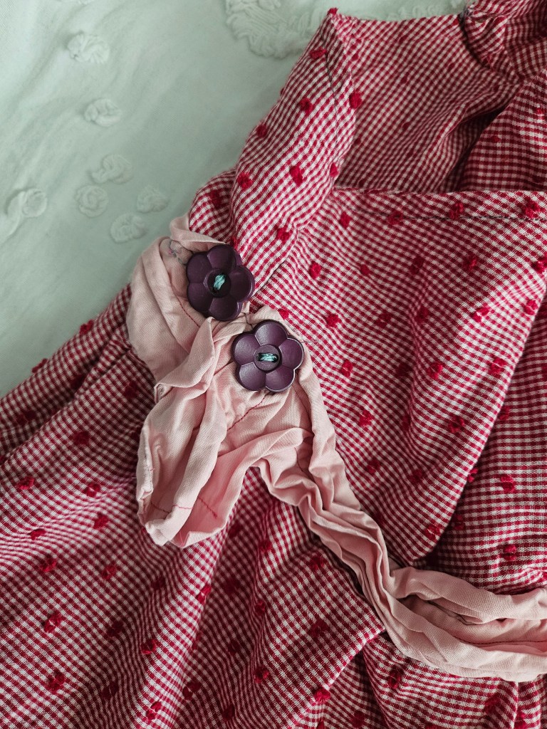 So when I was digging in my fabric stash this winter and found this interesting Swiss dot gingham, light pink trim, and flower buttons I knew one thing I had to make – my own take on a “strawberry” and “Sakura blossom” inspired dress.