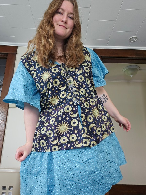 This vest was inspired by Dani’s costume from Hocus Pocus. It is made from a cotton print with a buttoned bodice and flared-out waist. The dress was made from cotton vintage deadstock fabric that I was gifted from my Grandma Schlachter’s fabric stash.