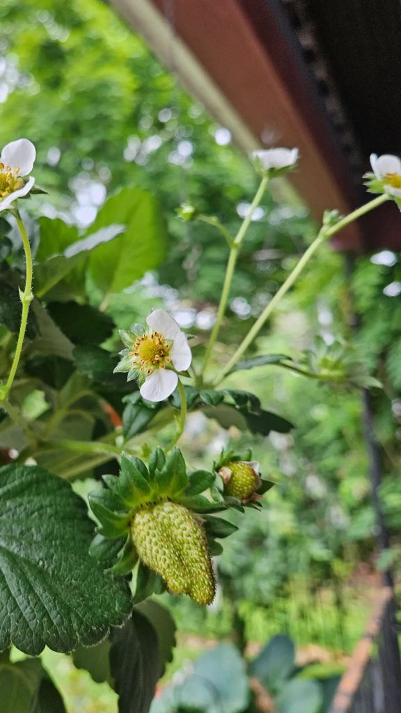 A perk of being on this small holiday of sorts from my life, and staying at my mom’s house means endless inspiration from her garden. Around Mother’s Day we went to a local greenhouse and found this hanging strawberry plant which beautifully displays its growing phases in lovely hanging tendrils.