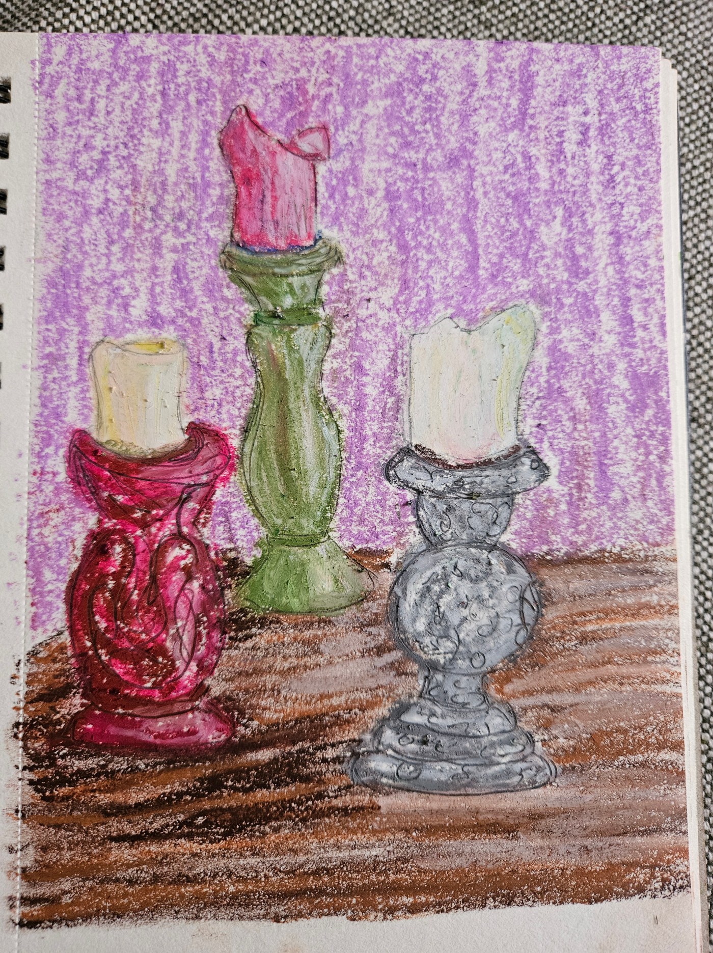 Candlesticks of glass, metal, and wood drawn in pencil and oil pastel on paper.