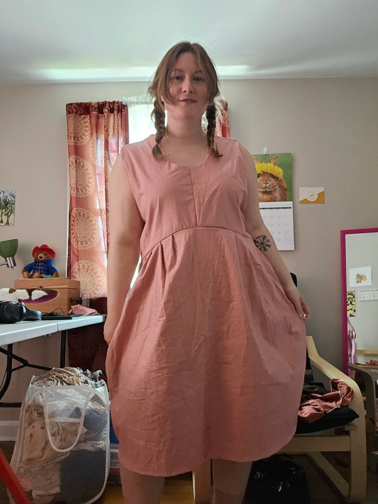 I used this pattern to make a pinafore-style dress from blush pink cotton with a micro polka-dot pattern in a vintage fabric from my Gram’s stash. She had 8 yards of it, and since it was translucent I decided to double layer the dress, the result has been one of the most well-finished garments I’ve made because of using the pattern and fully lining it. The first time I wore this dress out was actually to tour the house I ended up buying – good memories!
