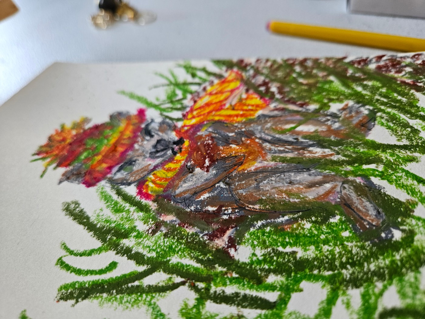 Chalk pastel on paper. A squirrel finds her treasure, an acorn.