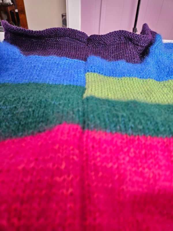 I had planned to have this project done by the time I reviewed the yarn, but as it is now April, and I’ve shifted to summer and spring knitting it is unlikely this project is wrapping up soon. Here’s a look at the project at its current state. 🙂