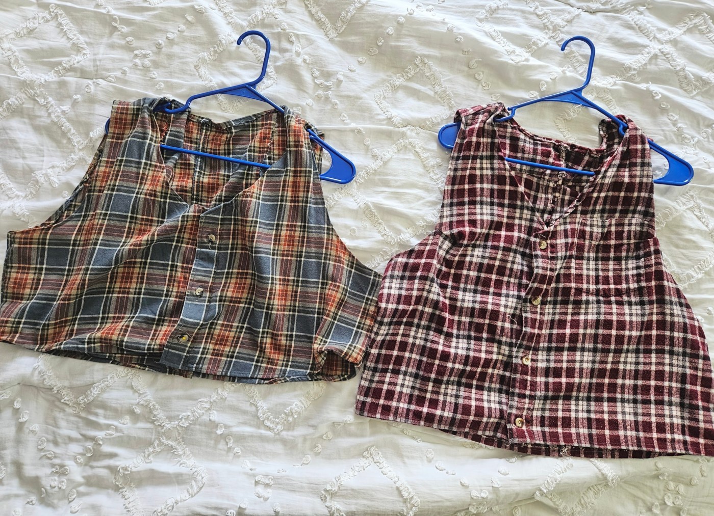 Last summer, I wanted to introduce vests into my wardrobe. I have made vests before for Kyle, but have not sewn a vest for myself before; I have knit them. Because this was a spontaneous idea, I needed to be budget-conscious and find a way to use what I had to make a vest. So I went to my closet and got creative! I had a few flannels in my closet that were hanging there, waiting for me to wear them, but I didn’t. That’s when I looked at the shirts closely – there was a button placket, shoulder yoke, and a sturdy fabric, with room to crop them. I saw the vest within the shirt, so I grabbed my scissors—and was a bit too zealous with the first one! Don’t be like me, have a plan. So how did I make this upcycle work? And what did I learn from my failed attempt?