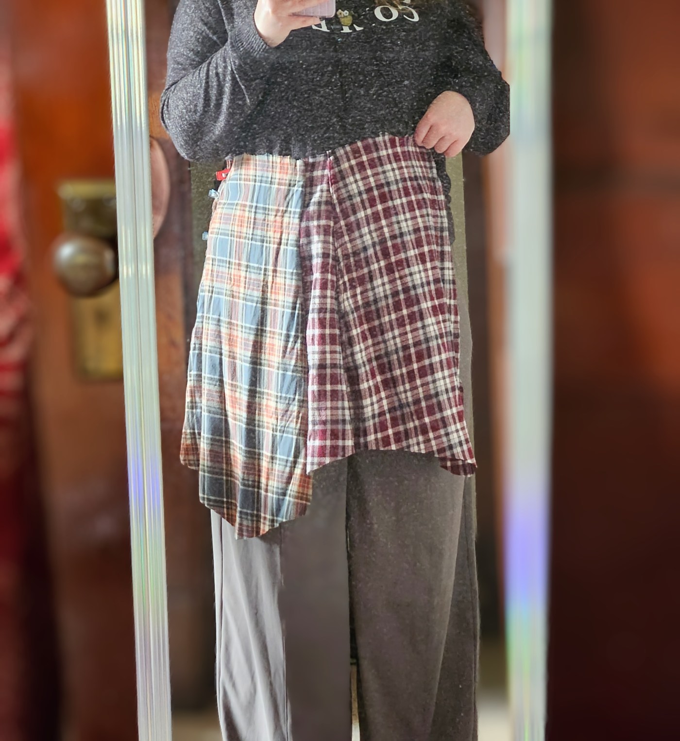Knowing how much yardage there is hidden in those sleeves, I had an idea – a plaid skirt with alternating colored plaid skirt panels connected by a waistband.