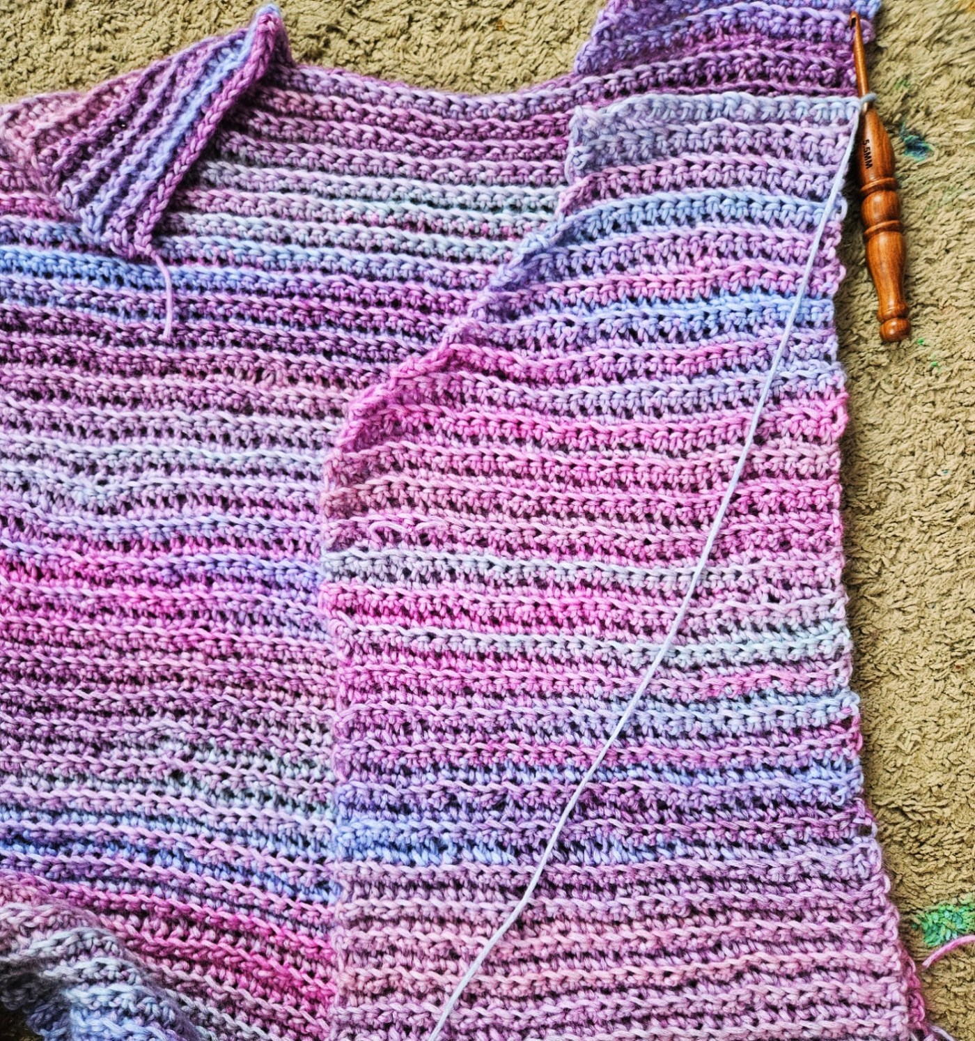 Well, I’m crocheting my first cardigan and to do this I decided to use Caron Blossom Cakes, specifically three cakes in the colorway Blossom. It’s a lovely tonal yarn with hints of sakura, periwinkle, and hydrangea blooms.