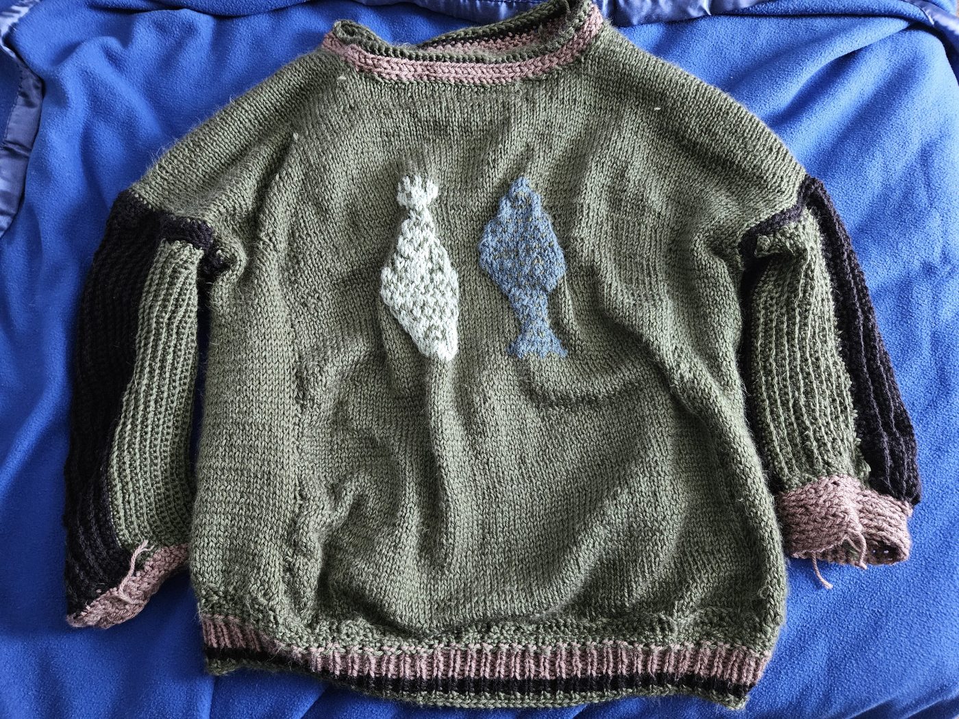 I learned a tremendous amount of knowledge from the Catch of the Day sweater, and I am grateful it all came together in the end to make a sweater that Kyle enjoys wearing. I have saved my patterns to attempt this again in the future with better yarn and proper dimensions to make the pattern fit well from the start, instead of scrambling to adjust at the end.