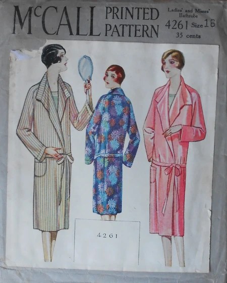 The flapper dress patterns you see in the store are so played out and inaccurate. My choice was influenced by the wonderfully boxy lines of this robe. It encapsulates the straight up and down silhouette of the time while looking like a piece that could be dressed up or down, for around the house or used for wearable garment in the right fabric.