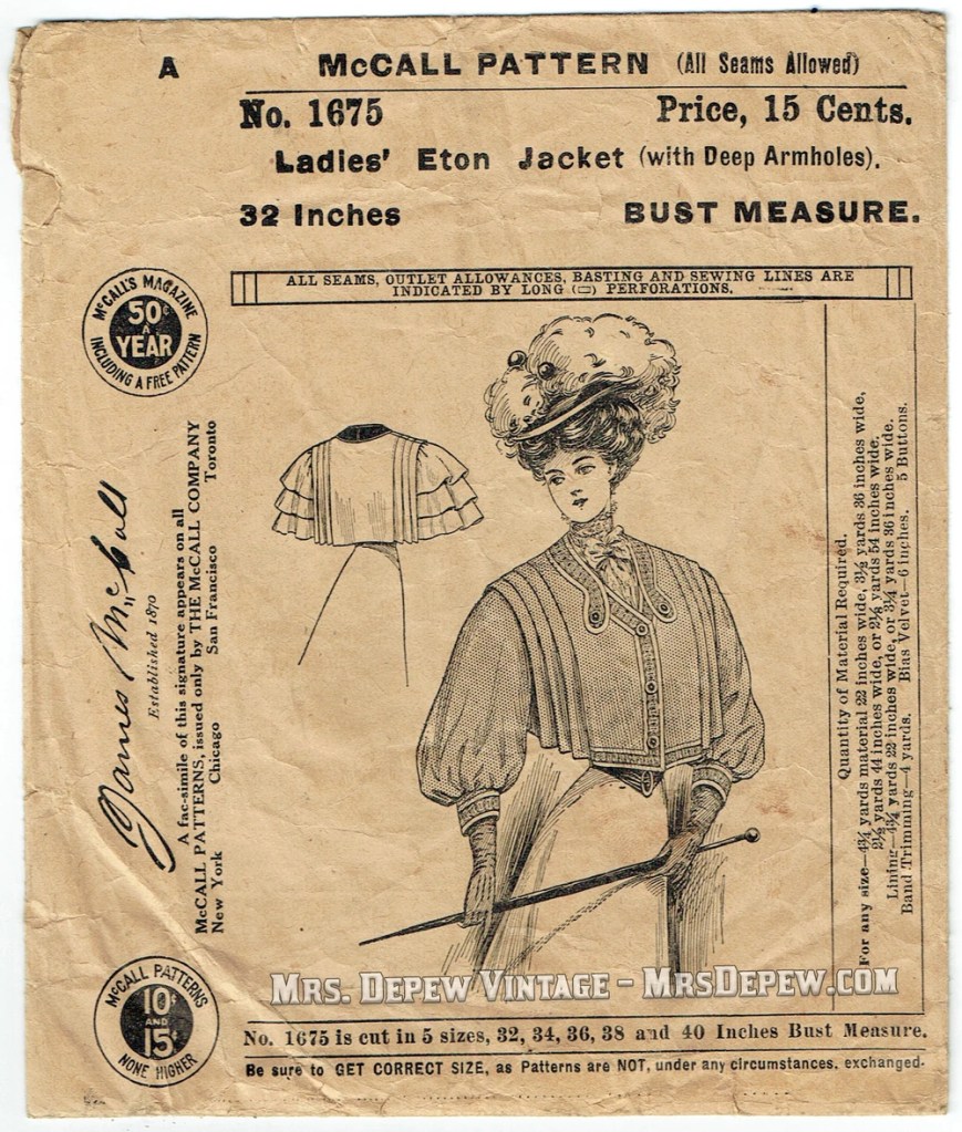 McCall 1675; ca. 1907; Ladies’ Eton Jacket (with deep armholes). Featured in McCall’s Magazine September 1907.