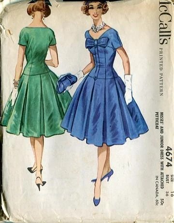 The 1950s is not my favorite era of fashion, mainly because this silhouette looks horrible on me and it’s really over done when people think of “vintage” so for inspiration I went to 1958, the year my grandparents got married to find something interesting. I like the bow on the front of this and flounce of the skirt. The shape reminds me a bit of a bridesmaids dress I tried on that my grandma wore for her friends’ wedding in the 1950s.