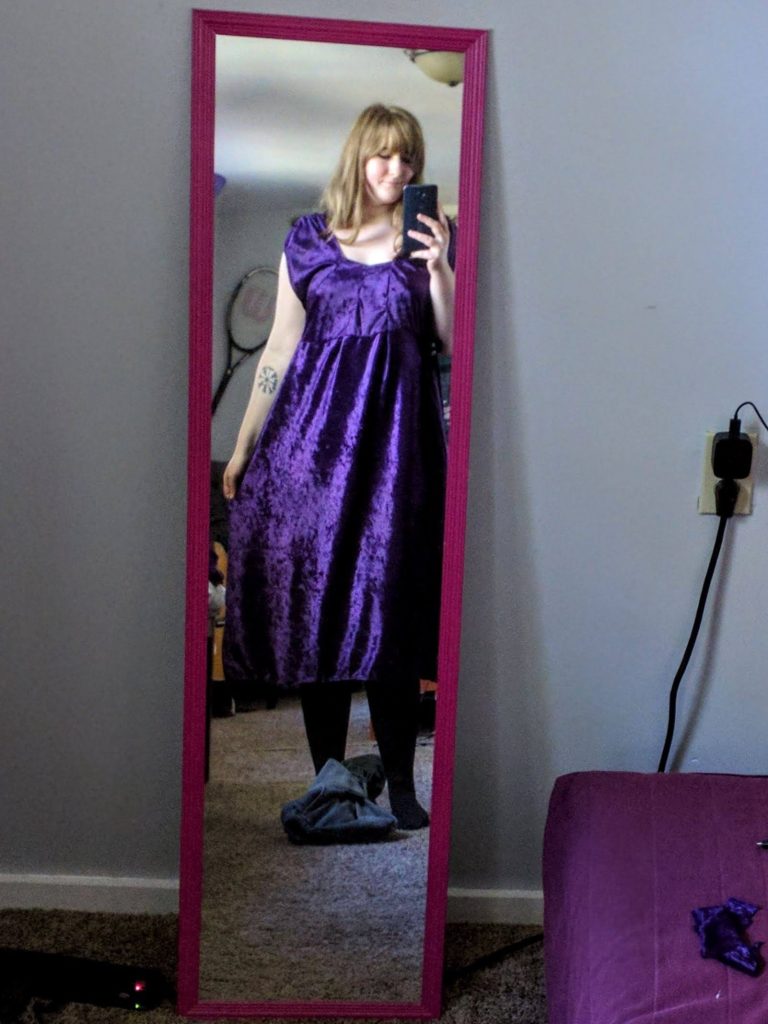 When we were living in Meadville in 2019 and I was getting into thrifting, I found a lovely 1990s dark purple velvet princess seam dress. It was longsleeved and midi length with a scoop neck and stretchy velvet knit that draped lovely from the waist. I could tell from the label it was vintage. It had a different attitude. The dress reminded me of dresses I wore as a kid that were so special yet accessible.