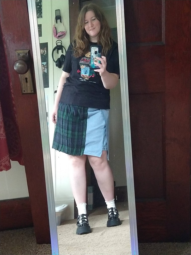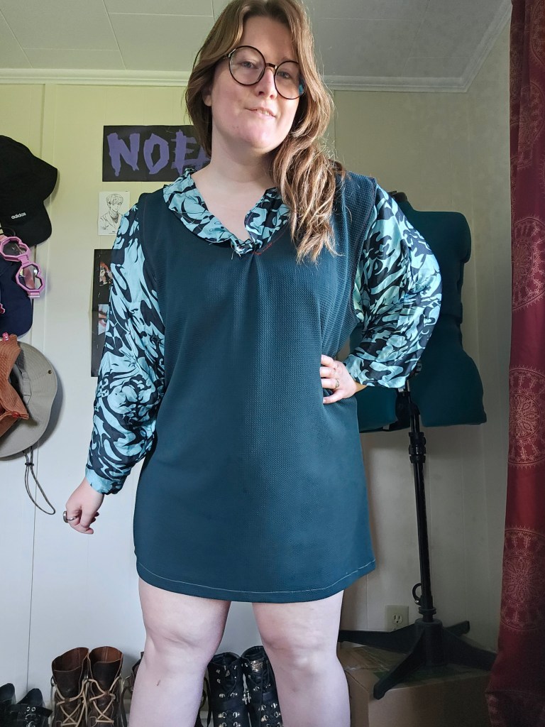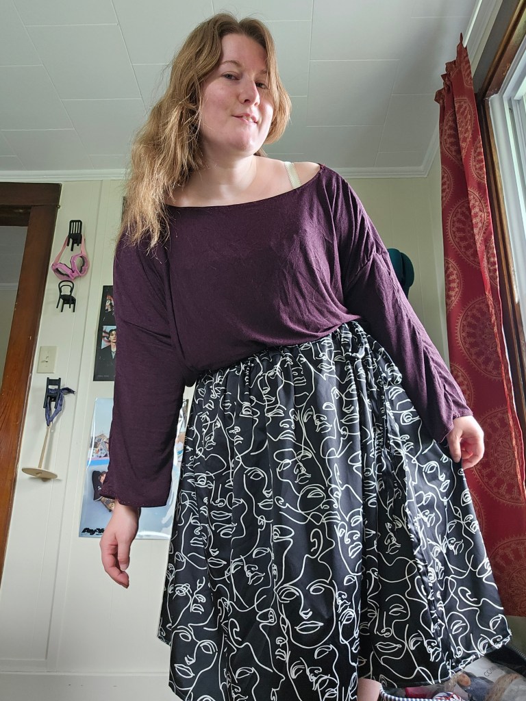 I chose to confront this feminine dress style once again. I knew it would clash with the natural lines of my body. I don’t have an hourglass body shape, which this fit and flare dress calls for. I’ve been scared to wear it, but I am challenging myself to try. I layered the sheer shirt I made in 2024 with this dress and a belt to create balance. It’s going to take time to get comfortable, for sure.