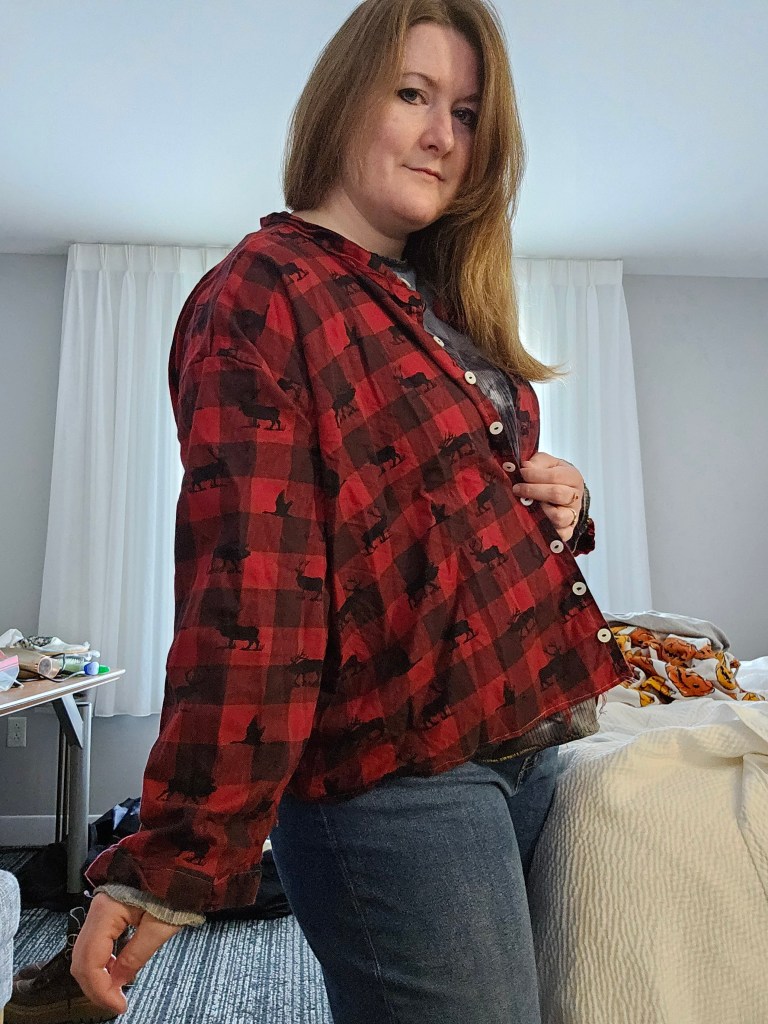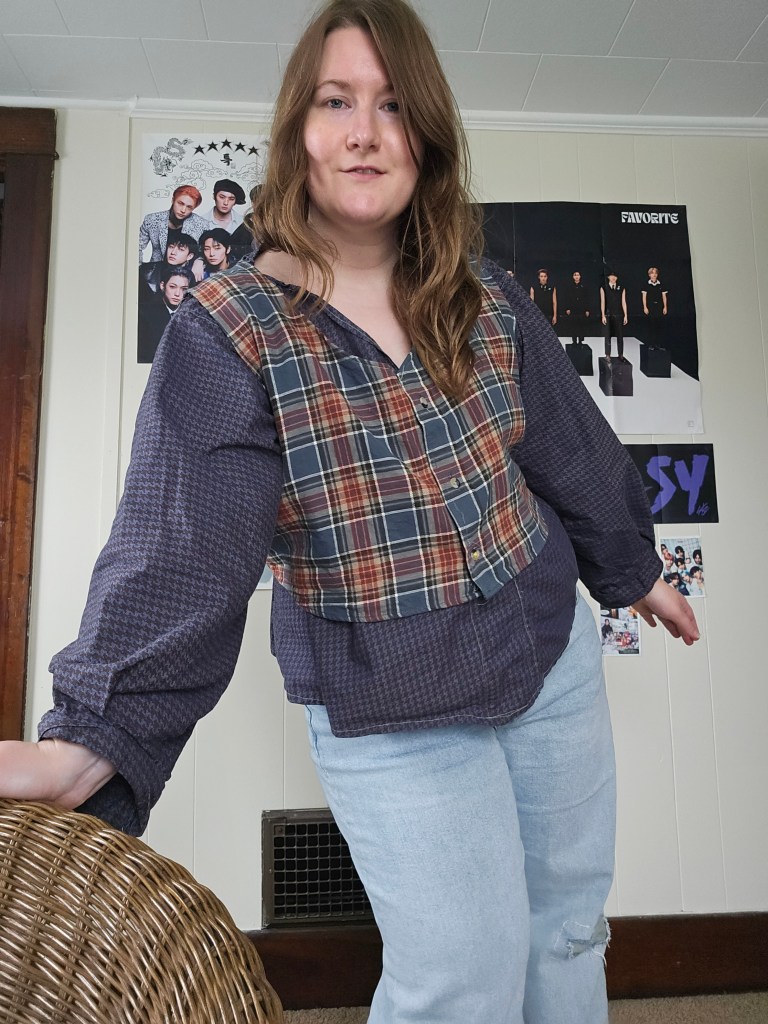 Last summer, I wanted to introduce vests into my wardrobe. I have made vests before for Kyle, but have not sewn a vest for myself before; I have knit them. Because this was a spontaneous idea, I needed to be budget-conscious and find a way to use what I had to make a vest. So I went to my closet and got creative! I had a few flannels in my closet that were hanging there, waiting for me to wear them, but I didn’t. That’s when I looked at the shirts closely – there was a button placket, shoulder yoke, and a sturdy fabric, with room to crop them. I saw the vest within the shirt, so I grabbed my scissors—and was a bit too zealous with the first one! Don’t be like me, have a plan. So how did I make this upcycle work? And what did I learn from my failed attempt?