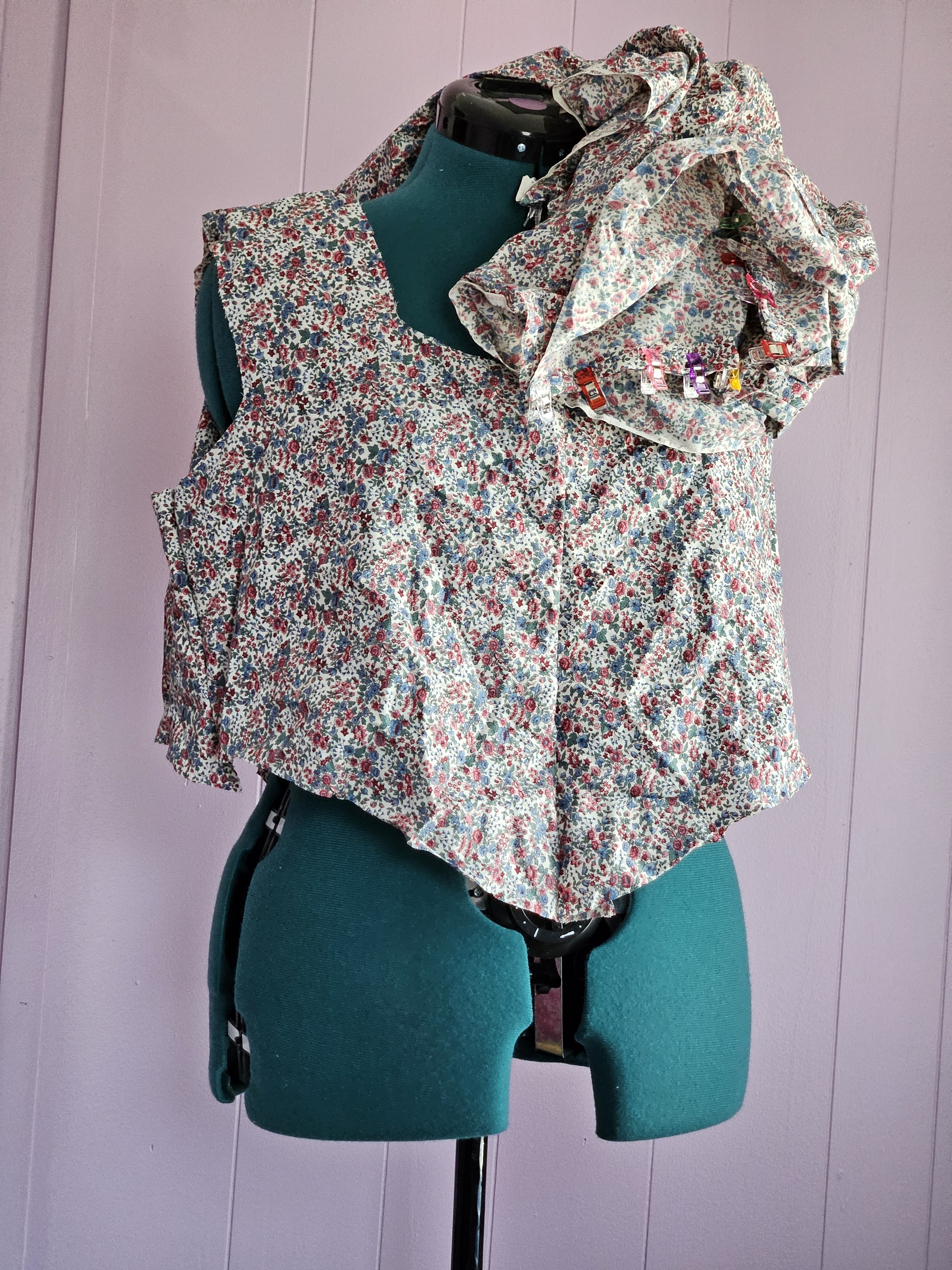 Enter this fabric and this bodice shape. It looks like an armor piece made of vintage ditzy flower fabric, lined with muslin. I wanted to reclaim what I learned in 2021, but try again in 2025, since the failure of my early projects made me shrink back to “easy” projects. I’ve made things that have challenged me a little bit, but not a true experiment. Constant growth is painful. Think of your body after consistent workouts, you’re going to hurt. It’s part of the process of getting stronger, and it feels at times like a negative experience. That feeling ground me down. I was tired of the learning experiences that felt more like loss and waste than an expression of crafting and artistry. It’s human, it’s passion, how can we not want the fruit of our labor to produce something good?