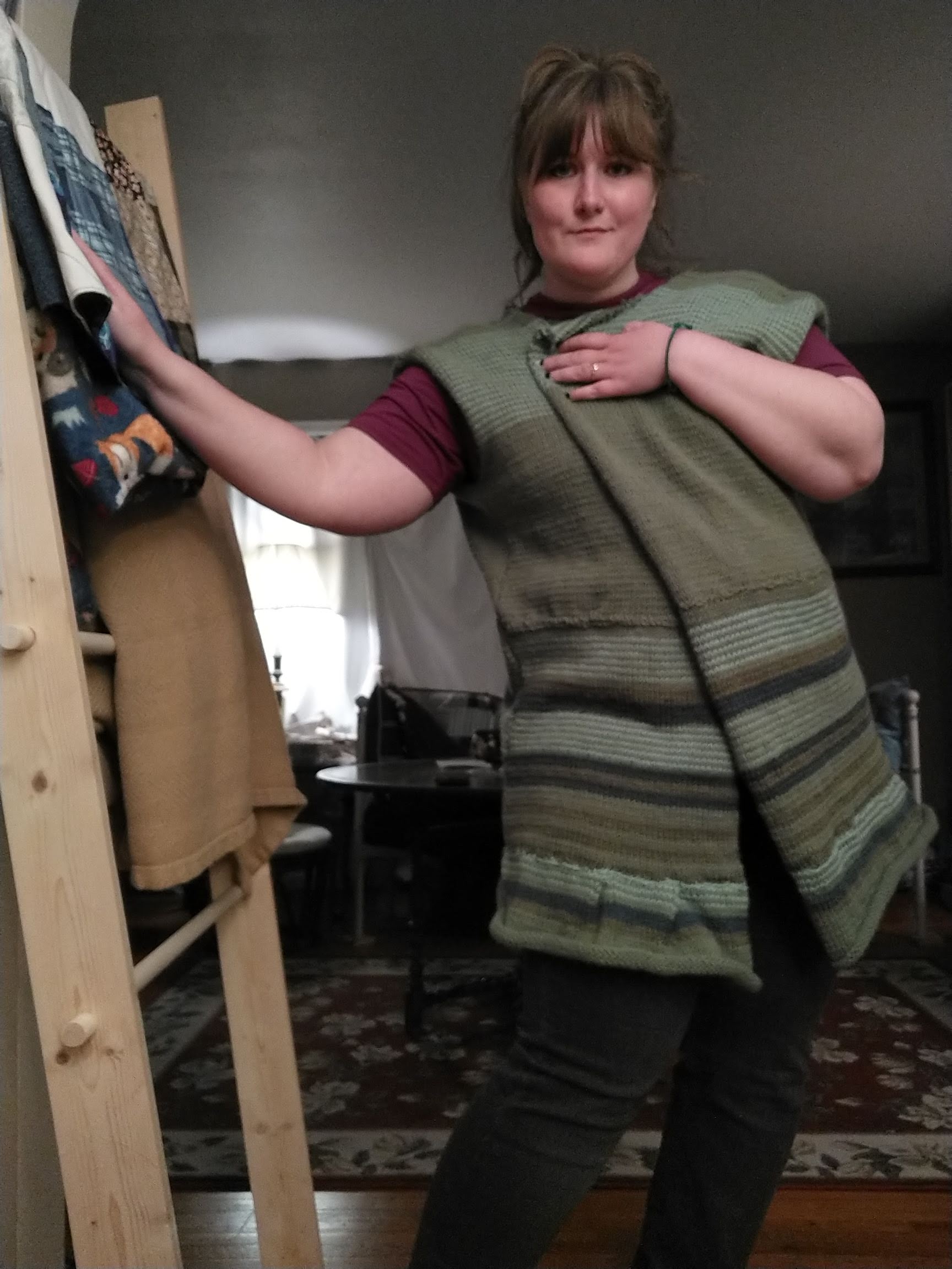 This was a good move. I made the first half 30 stitches wider than the previous body panels to create some drape around the hips and the results are cute. The sweater has this sophisticated little flare that accentuates the waist – I was not expecting that! 🙂