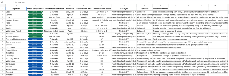 After we ordered our seeds, I created two more spreadsheets. The first is a general growing guide with information that serves as a guide that we can quickly access, sort, and search. Initially, it was just to track the start dates of everything so we could sort and know the order of when each seed needs to be sowed. It expanded to also include columns for germination time, distance between seeds, soil PH, fertilizer needs, watering information, and any other helpful notes. I want to keep much of this content in a field notebook that we can carry out to the garden with us, but this is helpful because it can all be viewed on one screen.