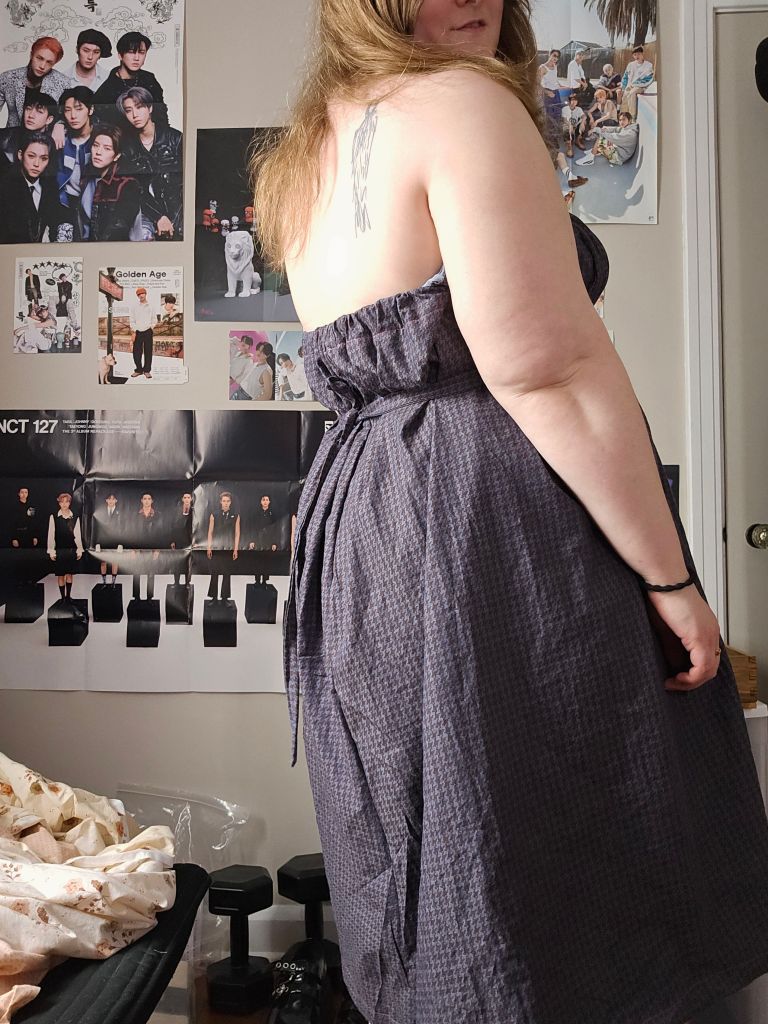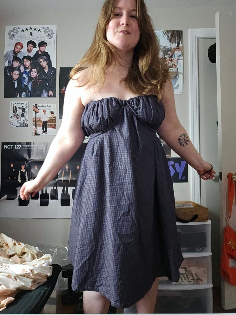 I thought this combination married both the silhouette of Rory’s style with the bold and playful textiles of Lorelai’s personal style. The blazer is not a Potato Technology piece, I ordered it from YesStyle, but the bustier top and skirt are my own designs. The Floral Print Grafitti Bustier Tank, I designed in 2023 from 1/2 a yard of fabric. This piece was draped and cut on the form. I wish I had known about making craft paper patterns at the time because it’s going to be a challenge to reproduce. The Expressions and Lines Skirt is a new design from this summer. It is a satin graphic print that for the first time, I was able to cut out the pattern directionally without any mishaps! I’m so pleased. 😀